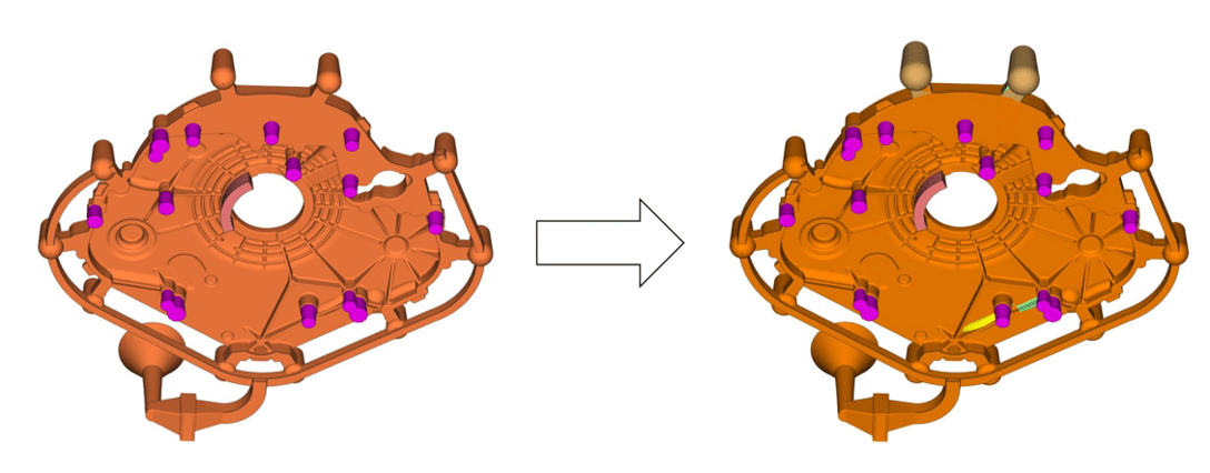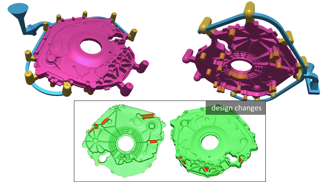 เพื่อแสดงให้เห็นถึงผลกระทบของการปรับเปลี่ยนการออกแบบชิ้นงานหล่อ เปรียบเทียบชิ้นงาน 2 ชิ้นที่มีระบบป้อนเติม / ทางวิ่ง ที่เหมือนกัน ซึ่งรูปด้านล่างจะเป็นชิ้นงานที่ถูกปรับแต่งโดยมีการเพิ่มความหนาของผนังบริเวณ rib