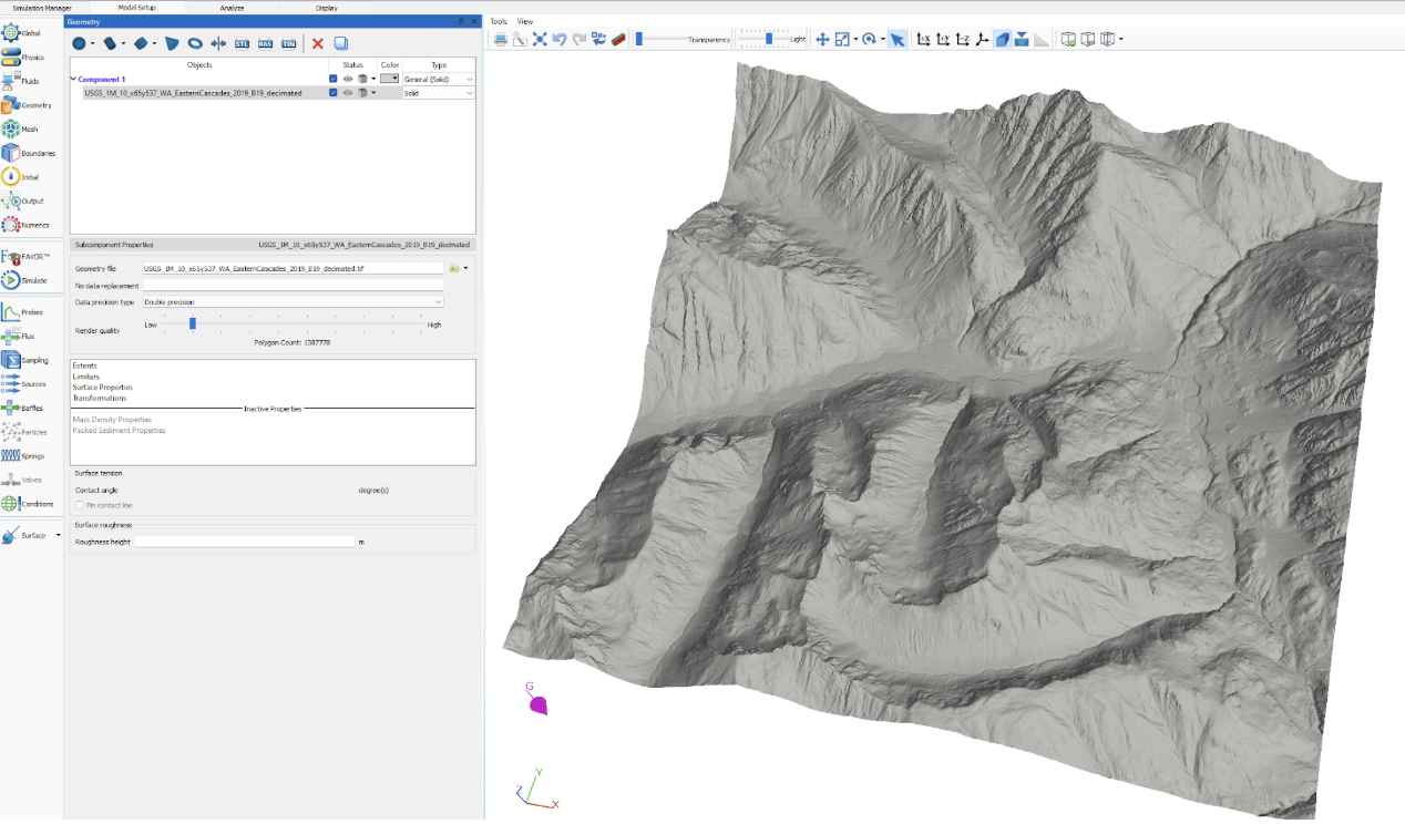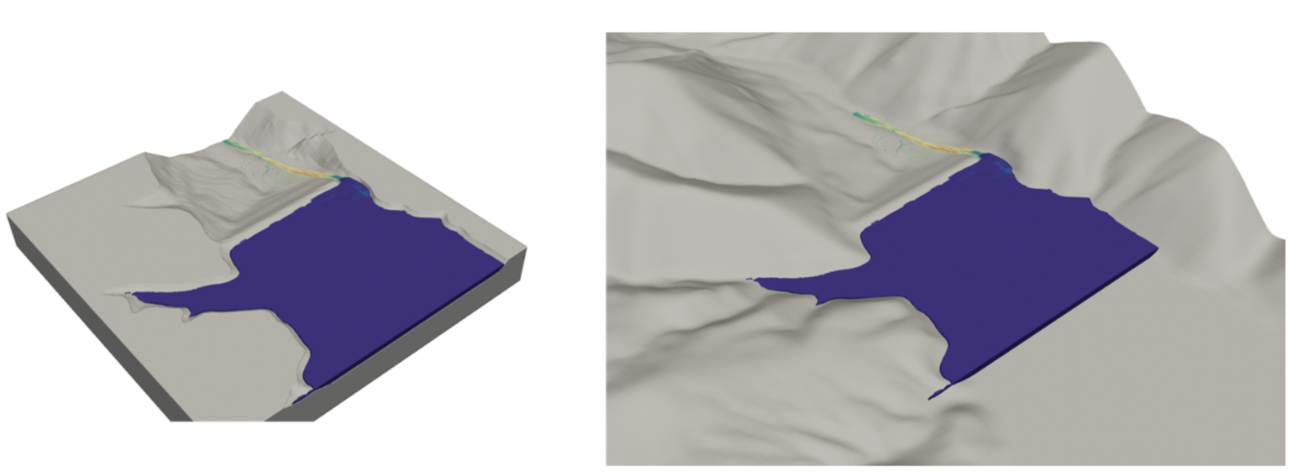 ภูมิประเทศภายในขอบเขตการจำลอง (ด้านซ้าย) เปรียบเทียบกับภูมิประเทศแบบสามเหลี่ยม (Triangulated Topography) (ด้านขวา) สังเกตว่าภูเขาและหุบเขาที่อยู่ปลายน้ำไม่ได้รวมอยู่ในขอบเขตการจำลอง แต่ภูมิประเทศแบบสามเหลี่ยมได้รวมสิ่งเหล่านี้ไว้เพื่อให้บริบทและความชัดเจนที่เหนือกว่า