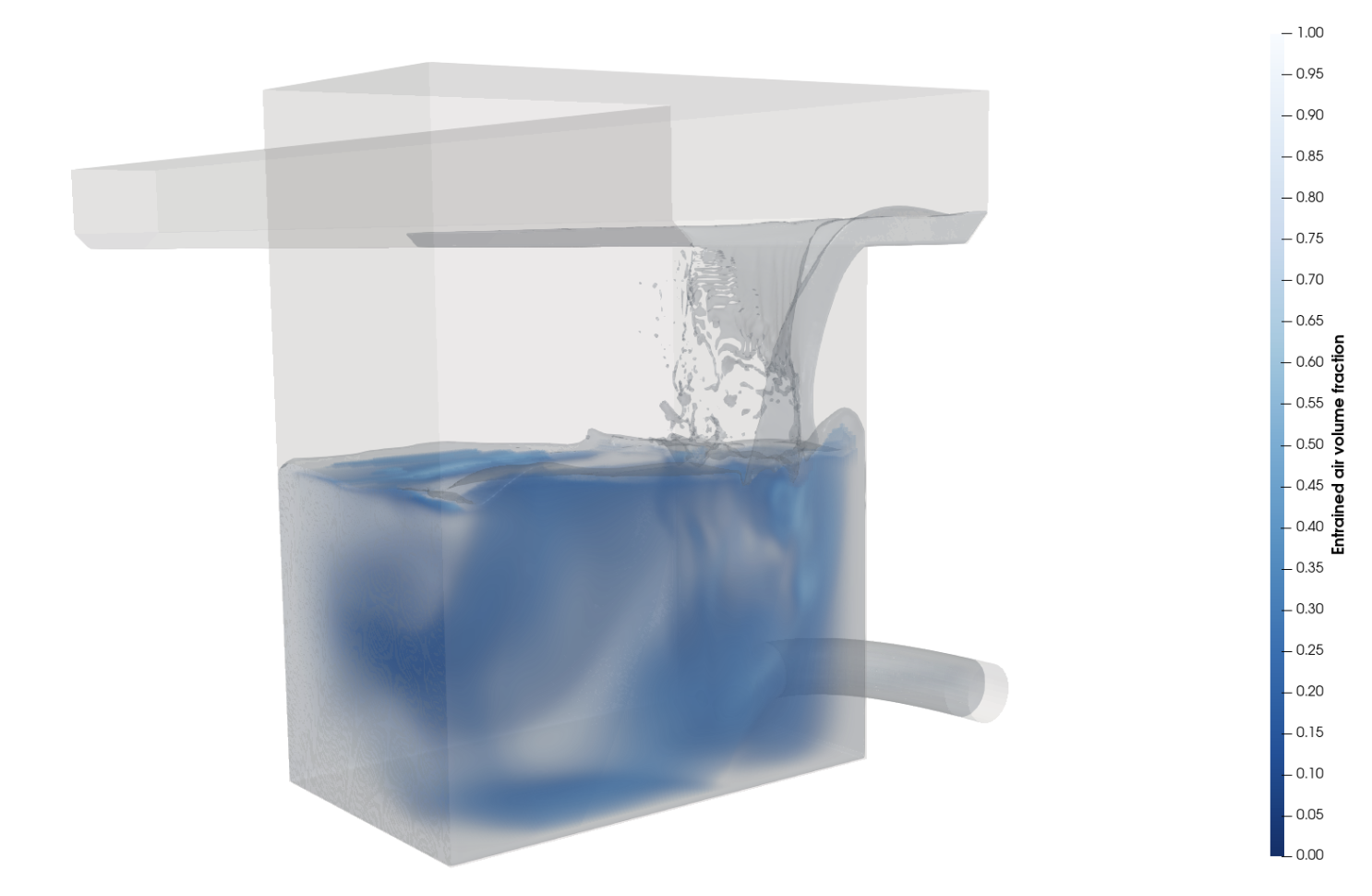 An example showing entrained air using the volume rendering capabilities in the new EXODUS II file format in FLOW-3D POST